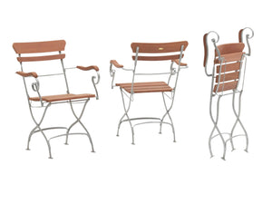 The companion to our popular florence chair is the armchair. It consists of a riveted and forged, folding metal frame with a four part broad slatted shaped wooden seat and scrolled metal arms with shaped wooden armrests. The two part, steam-bent, wooden backrest provides additional support.